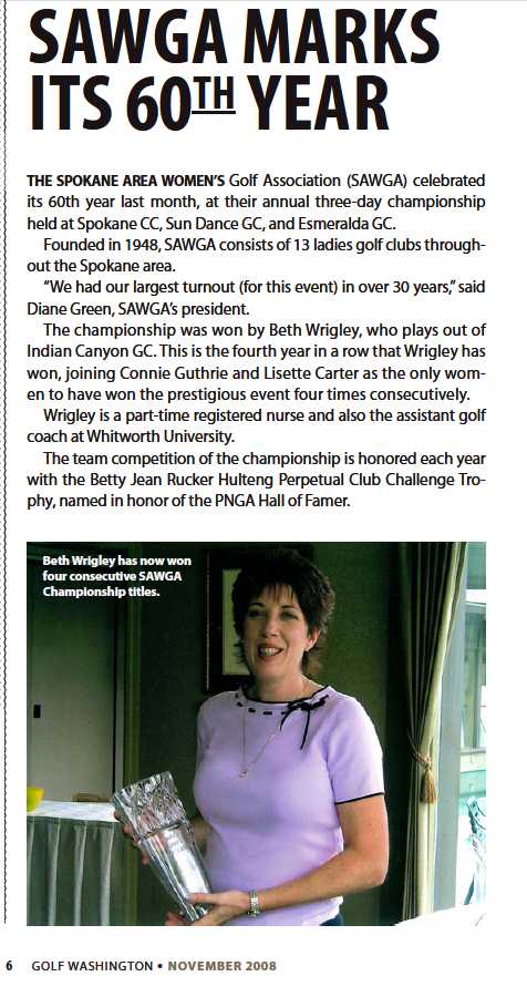 In 1962 the SWGA became the Spokane Area Women’s Golf Association, SAWGA, in the earnest hope that wider competition would bring better competition to an increasingly large number of women golfers. Charter members were Downriver, Esmeralda, Indian Canyon, Liberty Lake, Manito Golf & Country Club, Spokane Country Club and Wandermere. Guest clubs were Clarkston Country Club, Coeur d’Alene Country Club (of Hayden Lake), Coeur d’Alene Public Golf Course, Colfax Elks Golf Club, Lakeview Golf Club (Ephrata), Kellog Country Club, Moscow Golf Club, Moses Lake Golf & Country Club, Sandpoint Elk Golf Club and Shoshone Country Club (Wallace).